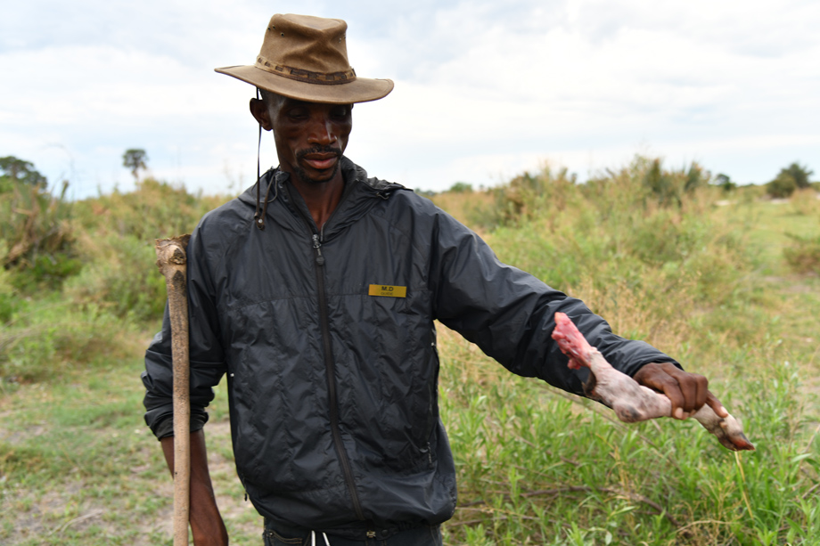 Ca. 500 Meter von unserem Camp entfernt fand unser Guide den Rest einer frisch gerissen Antilope nebst Tatzen Spuren einer Löwin. Für mich war sofort klar: Ich “klebe” nun am Rücken unseres Guides. Da kann mir nichts passieren! 😀