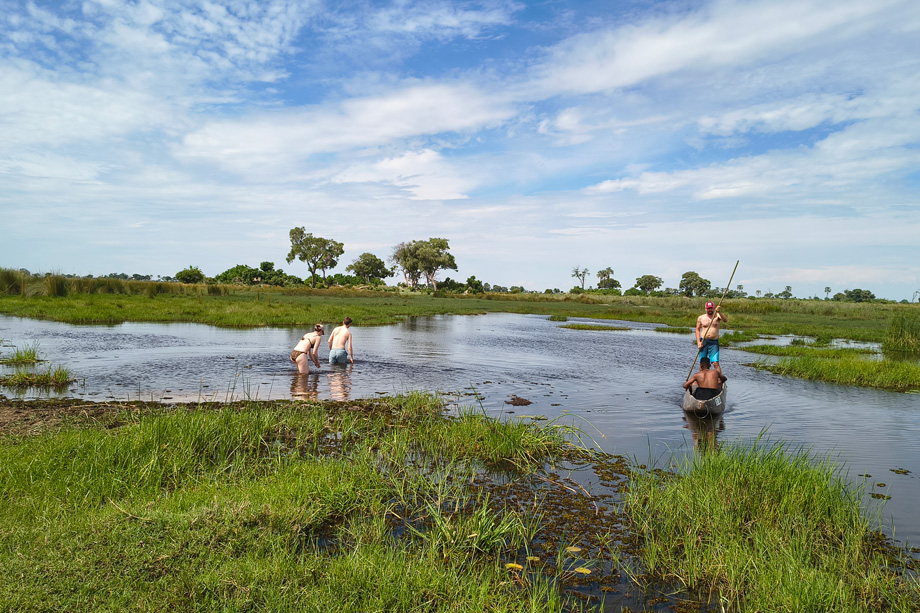 Am Nachmittag entschlossen sich dann einige “Jungs” aus unserer Gruppe im Delta baden zu gehen. Öhm – ja. Wenn man von Flusspferden und Krokodilen keine Angst hat – warum nicht? Nein, keine Sorge 🙂 Auch hier waren unsere lokalen Guides sehr bedacht, dass niemand zu Schaden kam.